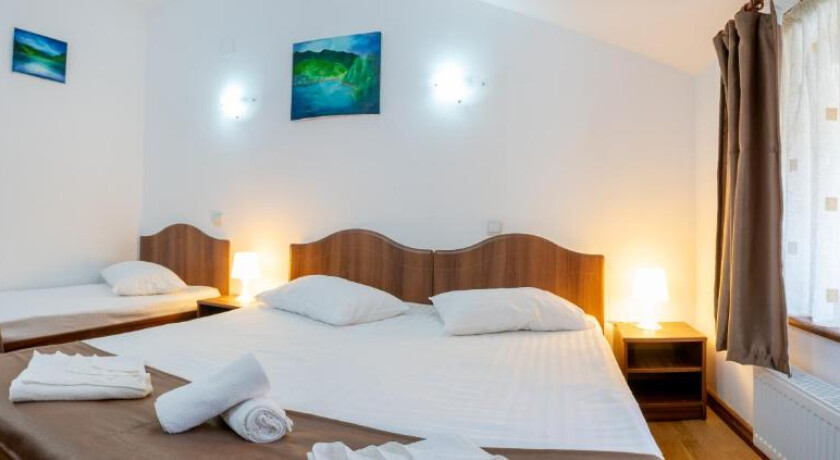 Proprietatea dispune de 12 camere confortabile (8 duble și 4 triple), potrivite pentru cupluri, familii și grupuri. Toate camerele sunt dotate cu baie proprie, TV, mini-frigider și Wi-Fi gratuit, iar unele camere au balcon cu vedere spre lac sau munți. Pensiunea a fost recent renovată și oferă o atmosferă primitoare.